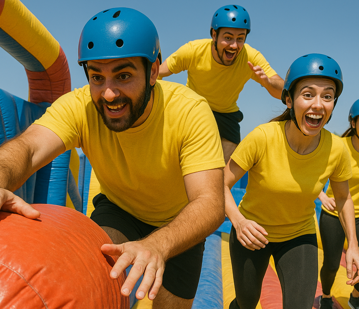 Pero eso no es todo. En la Guerra entre grupos, dividiréis vuestro equipo para competir en pruebas por puntos, donde la coordinación y el espíritu competitivo lo son todo. ¿Quién ganará la batalla de hinchables?